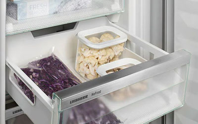 When the freezer drawers are opened and loaded, the integrated drawer slides give you convenient access to your food at all times. The pull-out stop prevents drawers from falling out when opened. On closing, the drawers slide into their final position with ease which ensures ideal air distribution in front of the drawers and therefore the best possible cooling.
