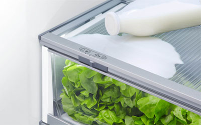 No more permanent dirty marks with our EZKleen feature for stainless steel refrigerators. Anti-fingerprint coating means you simply wipe clean any marks. Spill-safe secure glass shelves easily capture any drips or leaks.