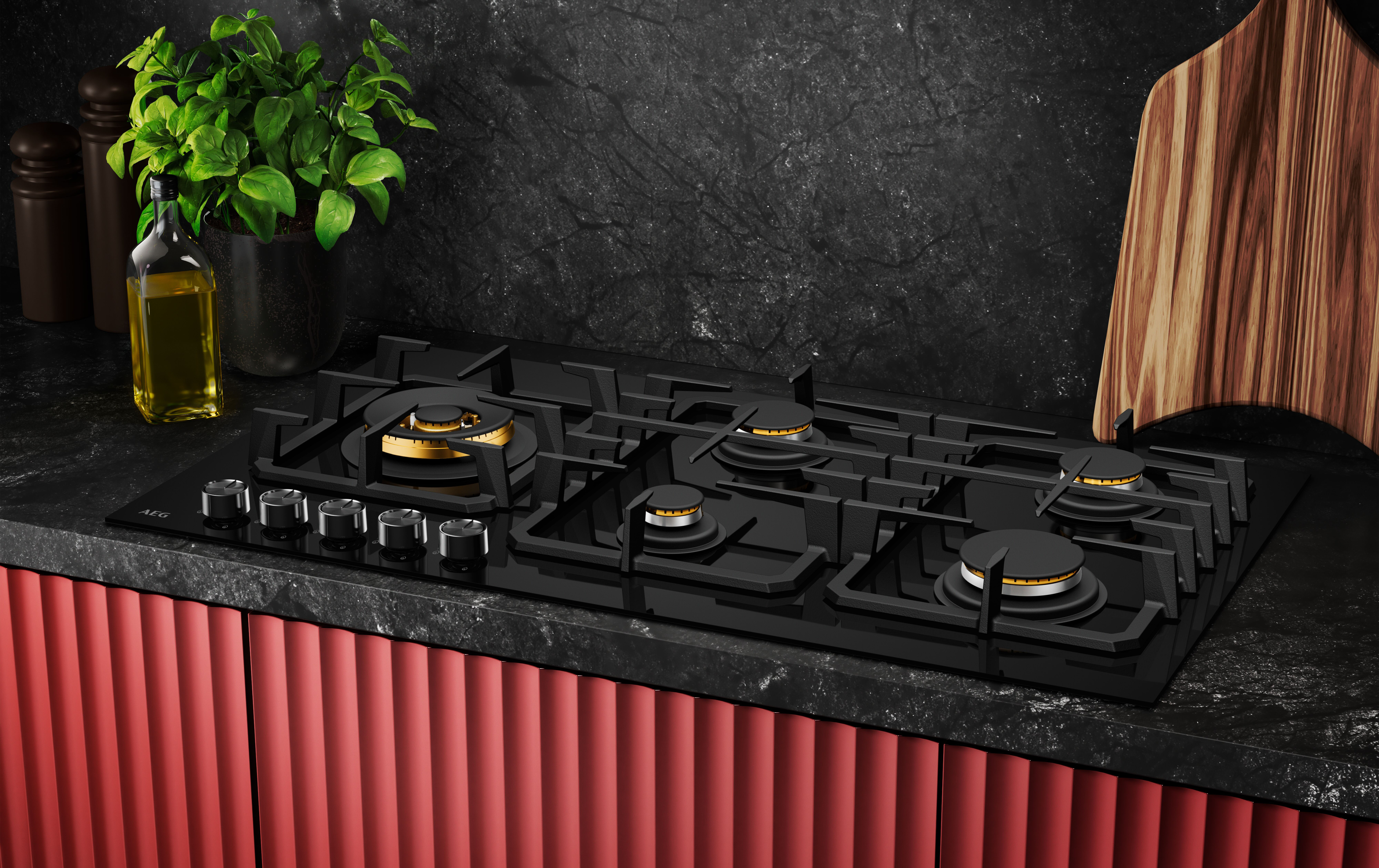 The AEG 90cm 5-Burner Gas Cooktop features a sleek ceramic glass design with a powerful 21.6MJ/hr wok burner, brass burner crowns, and DualFlame control for precise cooking. It includes cast iron trivets and an LP conversion kit for added versatility.