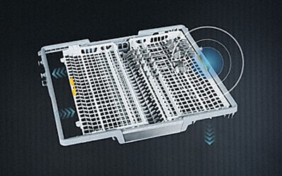 We have improved the cutlery tray, so it can now also accommodate even small items such as espresso cups. The 3D MultiFlex tray1 has a sunken central section and two side sections. The left-hand section can be pushed to the right to create space for tall wine glasses in the upper basket. The depth of the right-hand section can be adjusted to easily accommodate large items of cutlery and small items of crockery.