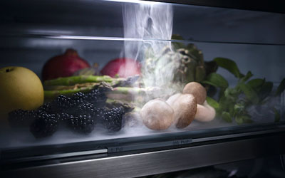 Miele’s PerfectFresh Active freshness system creates the perfect storage conditions in your refrigerator. Every 90 minutes and whenever the door is opened, it sprays a fine water mist into the drawer. This creates a gentle layer of moisture on your food and keeps the air humidity perfect at all times – regardless of how full the refrigerator is. All you have to do is fill the small water container, and your Miele appliance takes care of the rest.