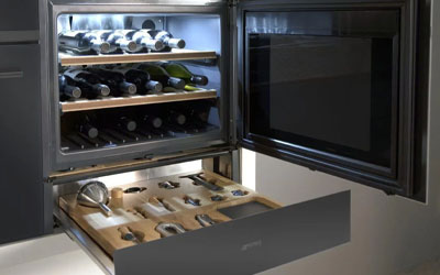 The custom made drawer insert houses speciality sommelier tools for storing, recording and serving wine. The ideal companion to the built-in wine cellar.